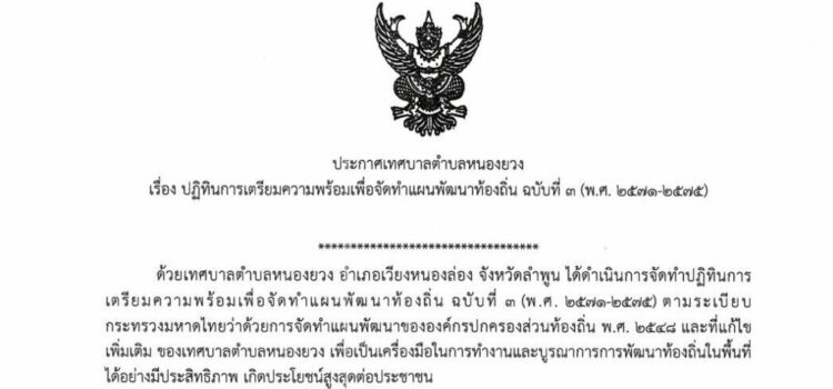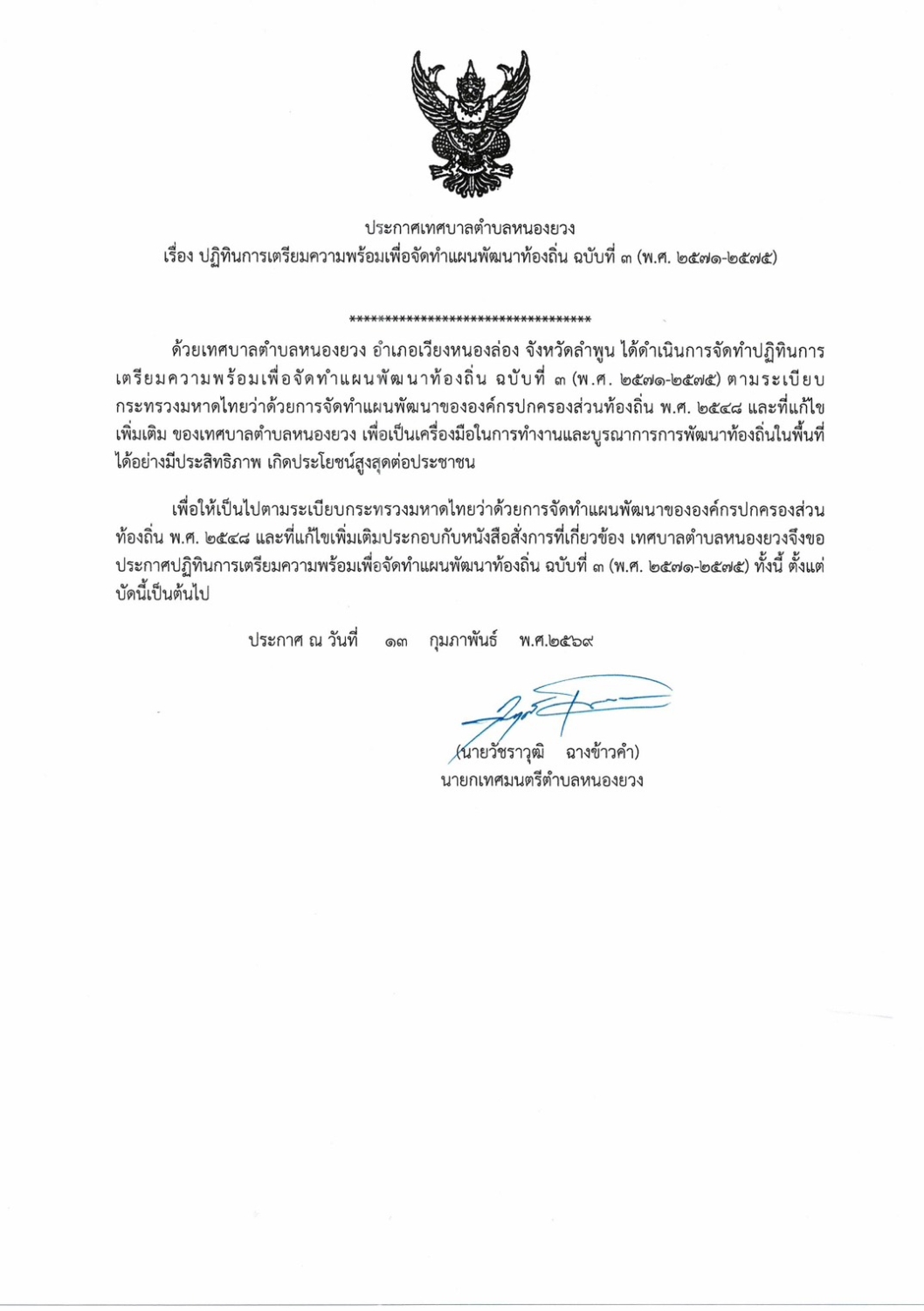 ประกาศเทศบาลตำบลหนองยวง เรื่องปฏิทินการเตรียมความพร้อมเพื่อจัดทำแผนพัฒนาท้องถิ่น ฉบับที่ 3 (พ.ศ.2571-2575) 18 ก.พ. 2026 40 views edituser Categories: ประกาศเทศบาลตำบลหนองยวง