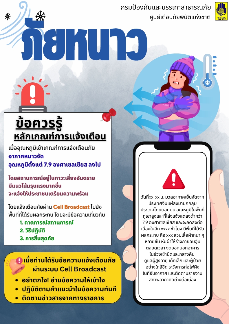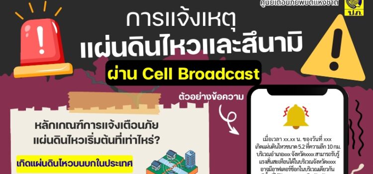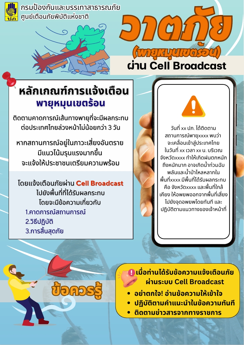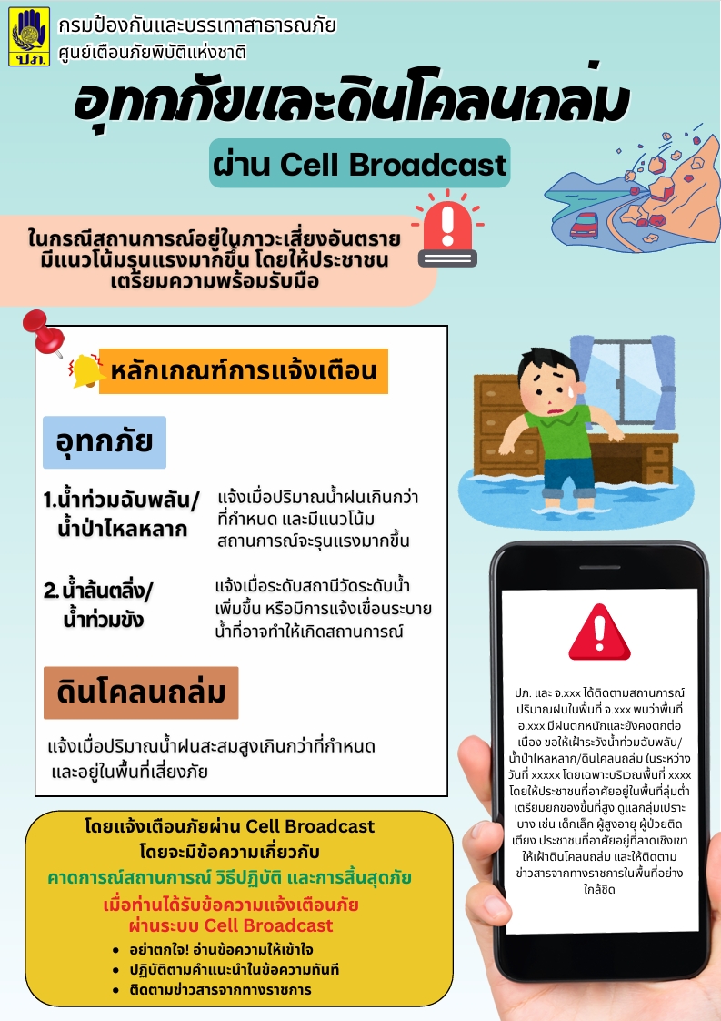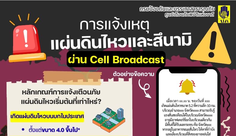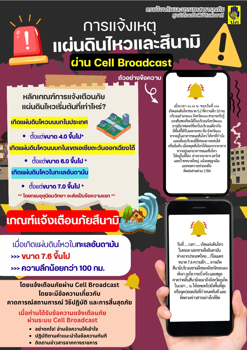 เทศบาลตำบลหนองยวง ขอประชาสัมพันธ์ เรื่อง การซักซ้อมแนวทางปฏิบัติการแจ้งเตือนภัยผ่านสัญญาณโทรศัพท์เคลื่อนที่ (Cell Broadcast) 19 ส.ค. 2025 81 views edituser เทศบาลตำบลหนองยวง ขอประชาสัมพันธ์ เรื่อง การซักซ้อมแนวทางปฏิบัติการแจ้งเตือนภัยผ่านสัญญาณโทรศัพท์เคลื่อนที่ (Cell Broadcast) เพื่อใช้เป็นเครื่องมือในการส่งข้อความแจ้งเตือนภัยล่วงหน้า ผ่านสัญญาณโทรศัพท์เคลื่อนที่ไปยังประชาชนจำนวนมากในระยะเวลารวดเร็วและสร้างการรับรู้ให้แก่ประชาชนเกี่ยวกับหลักเกณฑ์และแนวทางการแจ้งเตือนภัยต่อไป ……………………………………………………………………………. สามารถดาวน์โหลดเอกสาร อาทิ แนวทางปฏิบัติ (Standard Operating Procedure : SOP ) การแจ้งเตือนภัยผ่านระบบ Cell Broadcast และมาตรฐาน(Common Alerting Protocol: CAP ) การแจ้งเตืนภัย หัวข้อได้ที่ลิงค์นี้ https://onedrive.live.com/?id=A32356188E0B3184%21s8e8100814bcd46d7acf43e5abdf2106e&cid=A32356188E0B3184&redeem=aHR0cHM6Ly8xZHJ2Lm1zL2YvYy9hMzIzNTYxODhlMGIzMTg0L0VvRUFnWTdOUzlkR3JQUS1XcjN5RUc0QnRaOUViejBmdmYwR0dGWmhoZVdWcXc%5FZT1wbEVsYXo Categories: ข่าวประชาสัมพันธ์