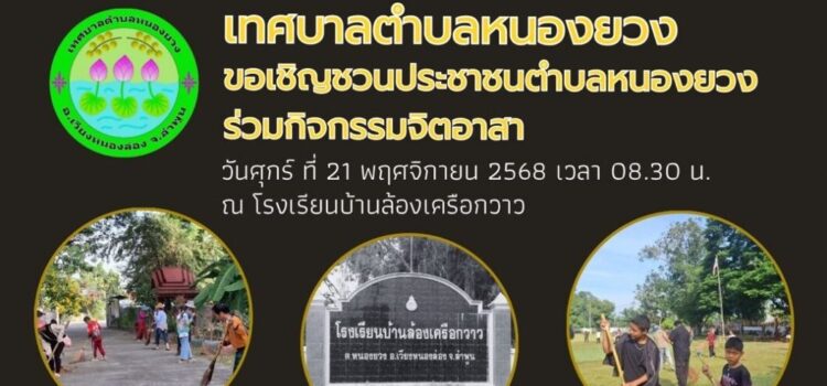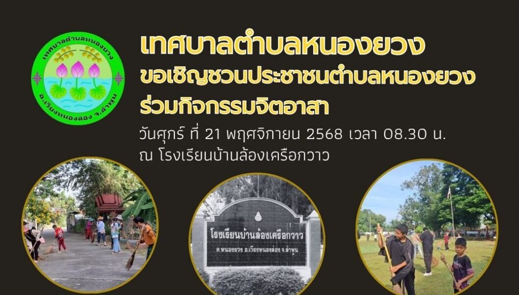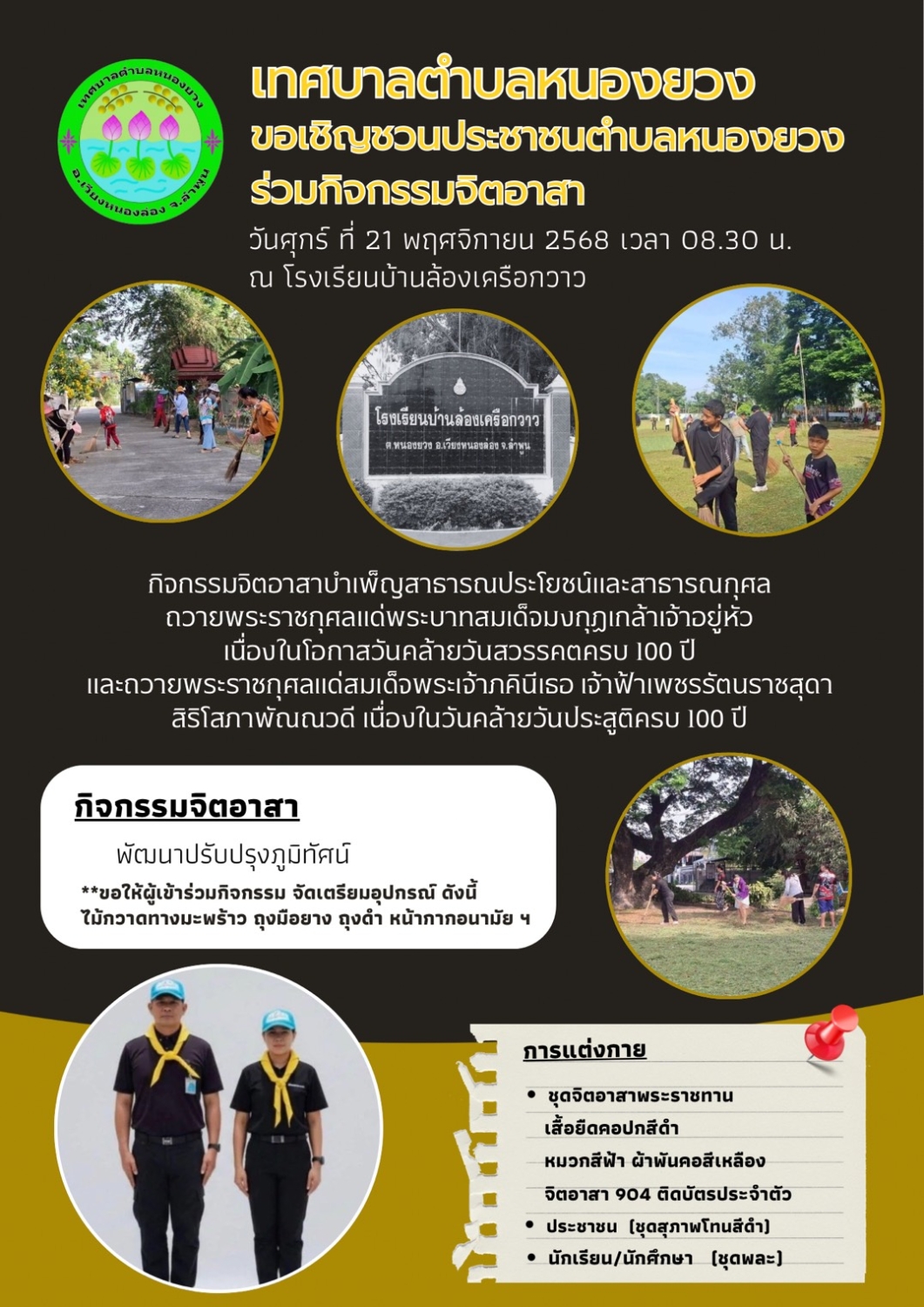 เทศบาลตำบลหนองยวงประชาสัมพันธ์ขอเชิญชวนประชาชนตำบลหนองยวงร่วมกิจกรรมจิตอาสาบำเพ็ญสาธารณประโยชน์ฯ 19 พ.ย. 2025 16 views edituser เทศบาลตำบลหนองยวงประชาสัมพันธ์ ขอเชิญชวนประชาชนตำบลหนองยวงร่วมกิจกรรมจิตอาสาบำเพ็ญสาธารณประโยชน์ฯและสาธารณกุศลถวายพระราชกุศลแด่พระบาทสมเด็จมงกุฎเกล้าเจ้าอยู่หัวเนื่องในโอกาสวันคล้ายวันสวรรคตครบ 100 ปี 25 พฤศจิกายน 2568 และถวายพระราชกุศลแด่สมเด็จพระเจ้าภคินีเธอ เจ้าฟ้าเพชรรัตนราชสุดาสิริโสภาพัณวดี เนื่องในวันคล้ายวันประสูติครบ 100 ปี 24 พฤศจิกายน 2568 วัน ศุกร์ ที่ 21 พฤศจิกายน 2568 เวลา 08.30 น. โรงเรียนบ้านล้องเครือกวาว หมู่ 5 ตำบลหนองยวง อำเภอเวียงหนองล่อง จังหวัดลำพูน การแต่งกาย * ชุดจิตอาสาพระราชทาน – เสื้อยืดคอปกสีดำ หมวกสีฟ้า ผ้าพันคอสีเหลือง จิตอาสา 904 ติดบัตรประจำตัว * ประชาชน (ชุดสุภาพโทนสีดำ) * นักเรียน/นักศึกษา (ชุดพละ) Categories: ข่าวประชาสัมพันธ์