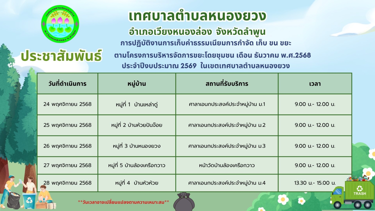 เพื่ออำนวยความสะดวกแก่ผู้เข้าร่วมโครงการฯ ทางเจ้าหน้าที่เทศบาลตำบลหนองยวง จะดำเนินการให้บริการจัดเก็บค่าธรรมเนียมนอกสถานที่ ประจำเดือนธันวาคม ตามตารางดังกล่าว ตั้งแต่วันที่ 24 พฤศจิกายน – 28 พฤศจิกายน 2568