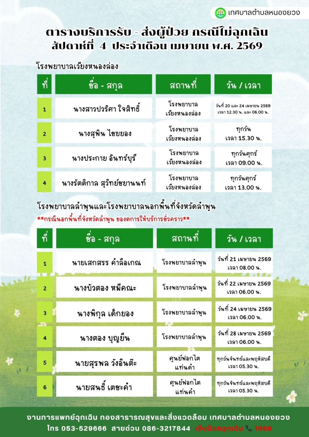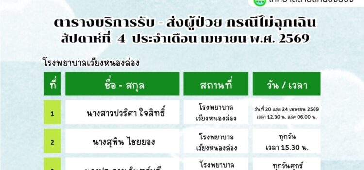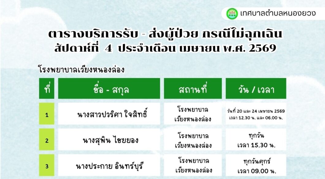 เทศบาลตำบลหนองยวง ประชาสัมพันธ์ ตารางบริการรับ – ส่ง ผู้ป่วย กรณีไม่ฉุกเฉิน สัปดาห์ที่ 4 ประจำเดือน เมษายน พ.ศ. 2569