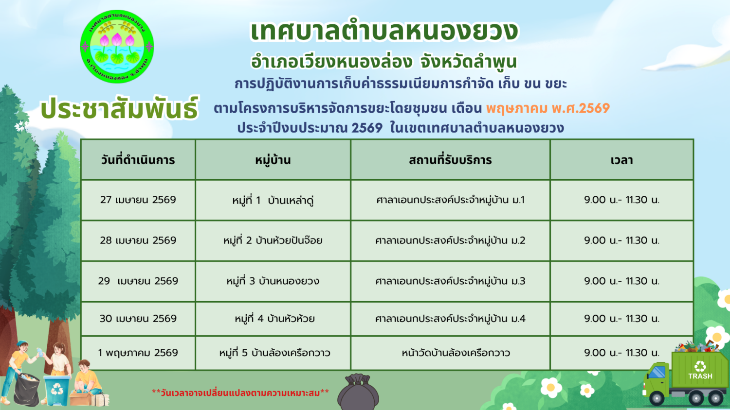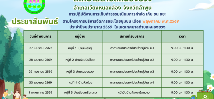เทศบาลตำบลหนองยวง ประชาสัมพันธ์ ตารางการให้บริการจัดเก็บค่าธรรมเนียมขยะนอกสถานที่ ประจำเดือน พฤษภาคม พ.ศ. 2569 24 เม.ย. 2026 3 views edituser เทศบาลตำบลหนองยวง ประชาสัมพันธ์ ตารางการให้บริการจัดเก็บค่าธรรมเนียมขยะนอกสถานที่ ประจำเดือน พฤษภาคม พ.ศ. 2569 เพื่ออำนวยความสะดวกแก่ผู้เข้าร่วมโครงการฯ ทางเจ้าหน้าที่เทศบาลตำบลหนองยวง จะดำเนินการให้บริการจัดเก็บค่าธรรมเนียมนอกสถานที่ ประจำเดือนมกราคม ตามตารางดังกล่าว ตั้งแต่วันที่ 27 เมษายน – 1 พฤษภาคม 2569 หมายเหตุ : วันเวลาอาจเปลี่ยนไปตามความเหมาะสม จึงขอความร่วมมือจากประชาชนผู้เข้าร่วมโครงการฯ โปรดมาชำระค่าธรรมเนียมตามวันและเวลาที่กำหนด เพื่อให้การดำเนินโครงการเป็นไปด้วยความเรียบร้อย เทศบาลตำบลหนองยวง ขอขอบพระคุณทุกท่านเป็นอย่างสูงมา ณ โอกาสนี้ Categories: ข่าวประชาสัมพันธ์