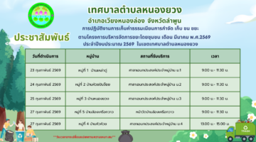ข่าวประชาสัมพันธ์ เทศบาลตำบลหนองยวง ประชาสัมพันธ์ ตารางการให้บริการจัดเก็บค่าธรรมเนียมขยะนอกสถานที่ ประจำเดือน มีนาคม พ.ศ. 2569 19 ก.พ. 2026 62 views edituser เทศบาลตำบลหนองยวง ประชาสัมพันธ์ ตารางการให้บริการจัดเก็บค่าธรรมเนียมขย… ดูเพิ่มเติม